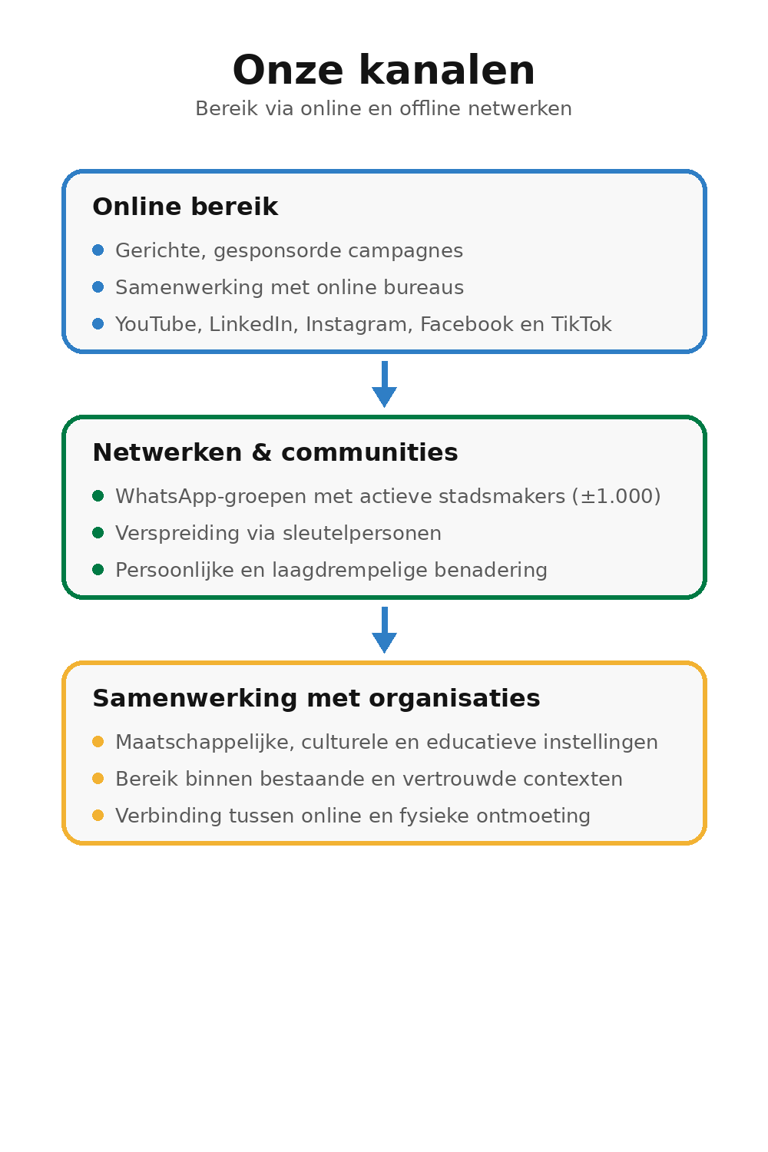 landelijke WhatsApp-groepen met actieve stadsmakers (circa 1.000 deelnemers), die als doorgeefluik fungeren binnen lokale netwerken