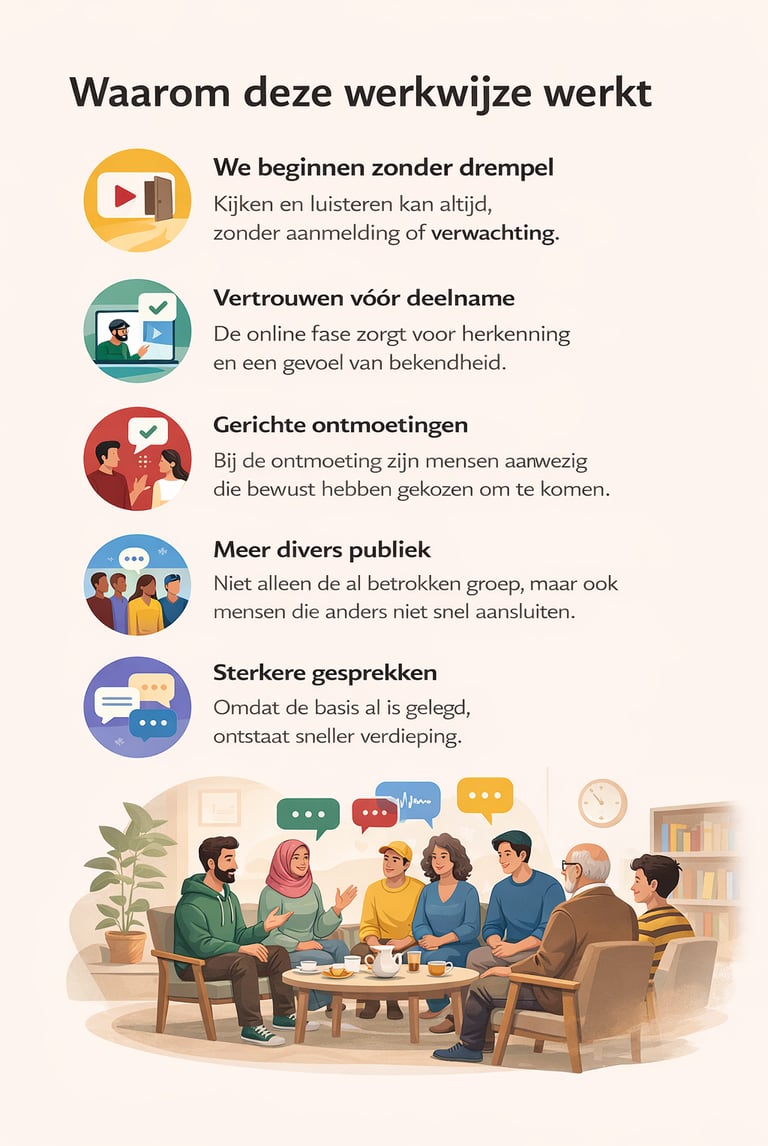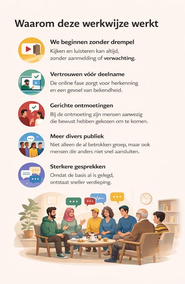 Deze werkwijze is interessant voor organisaties die mensen willen bereiken die niet vanzelf aanhaken, maar wรฉl interesse hebben in maatschappelijke en culturele themaโs.